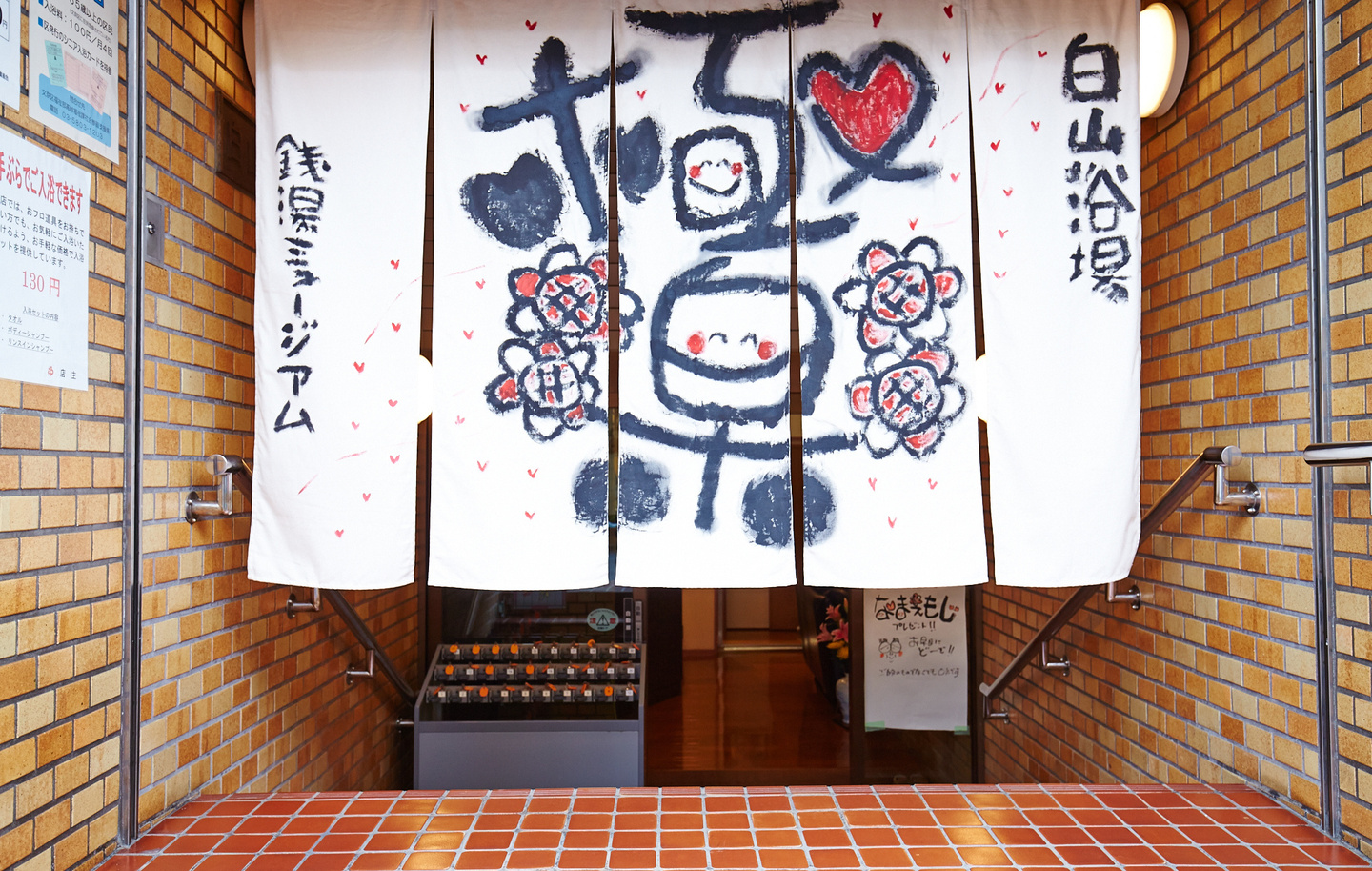 タイルの目地まで真っ白に磨き上げられた、とにかく清潔なお風呂屋さん。女将さん手作りの暖簾や展示品が楽しいですね。
